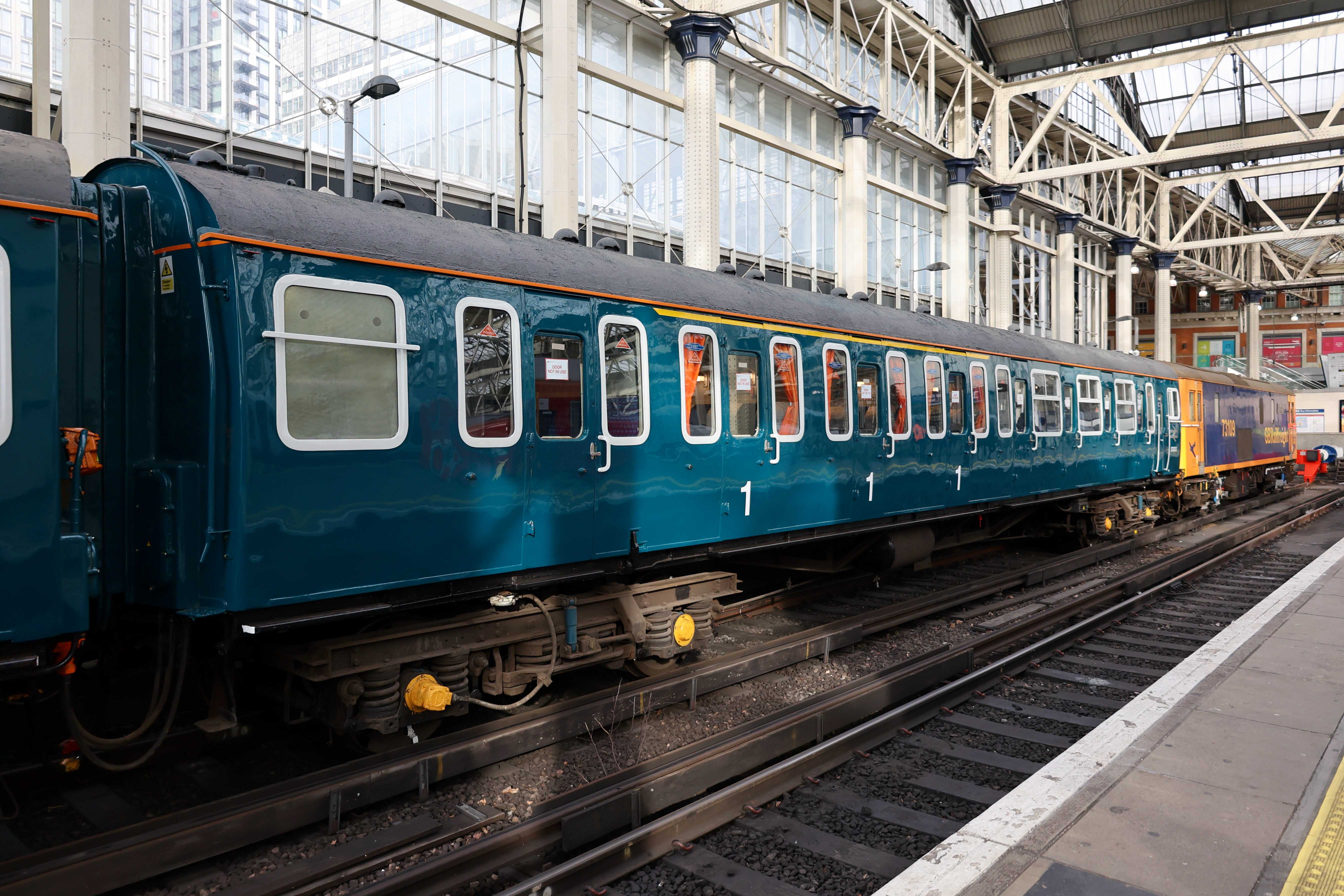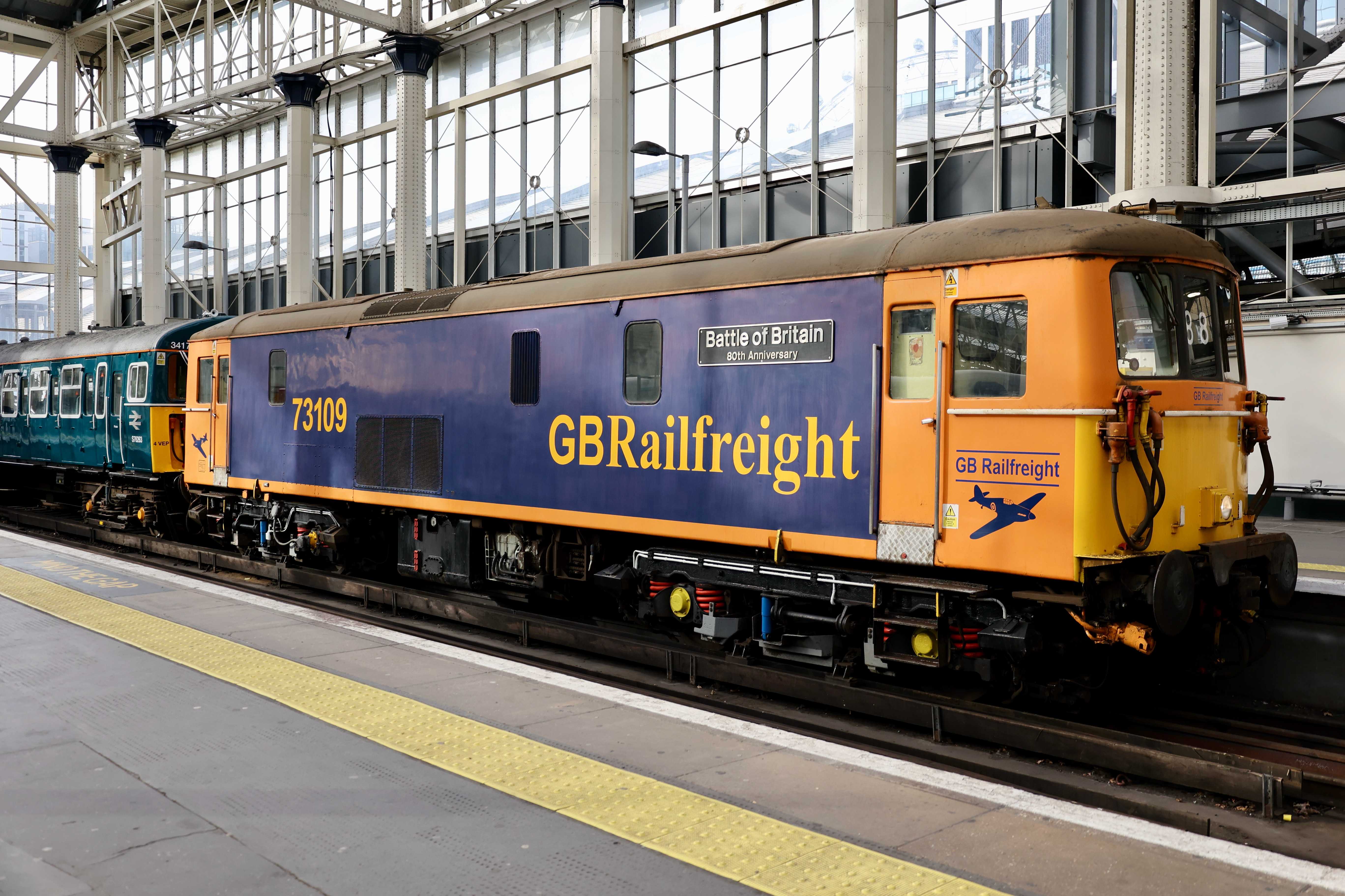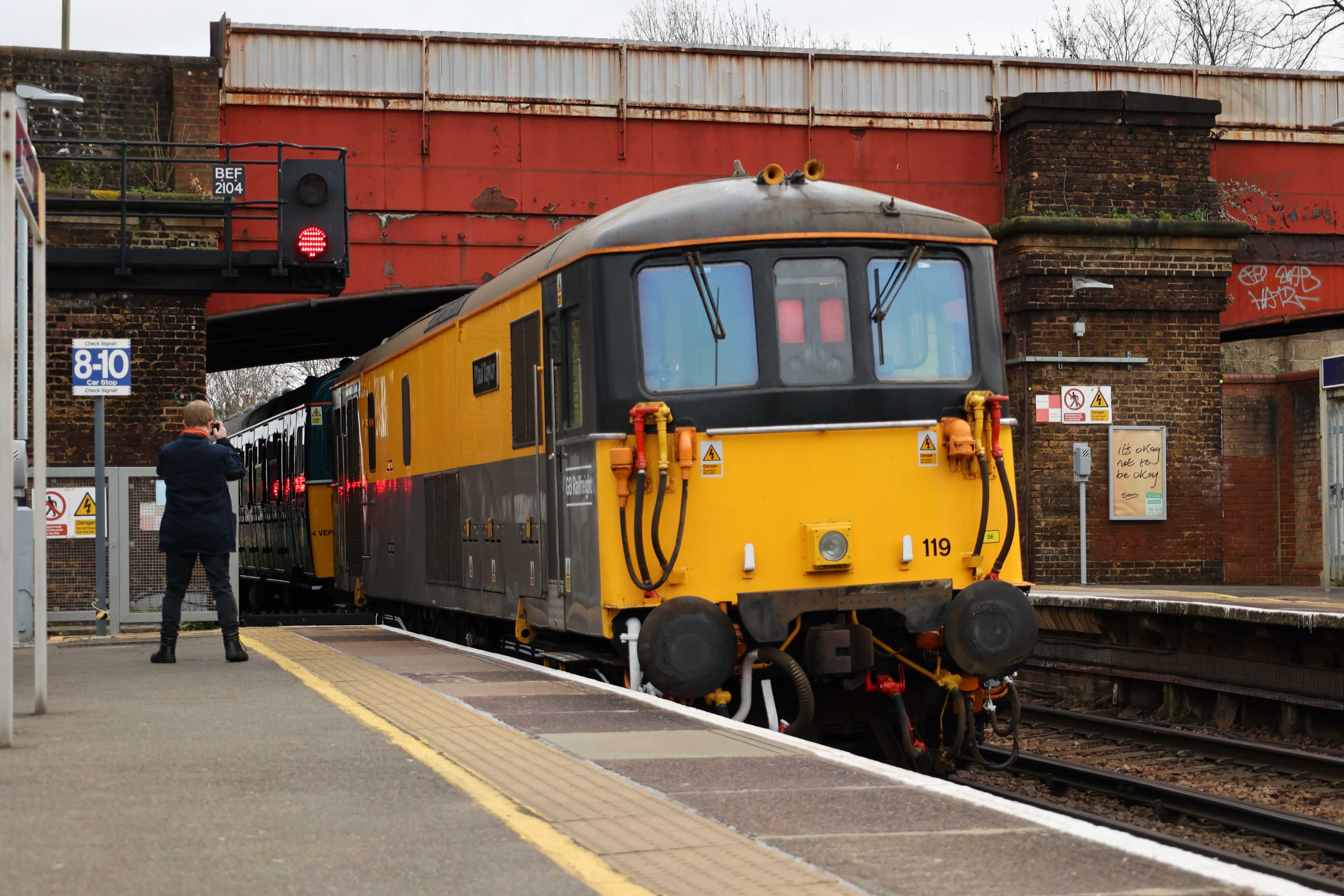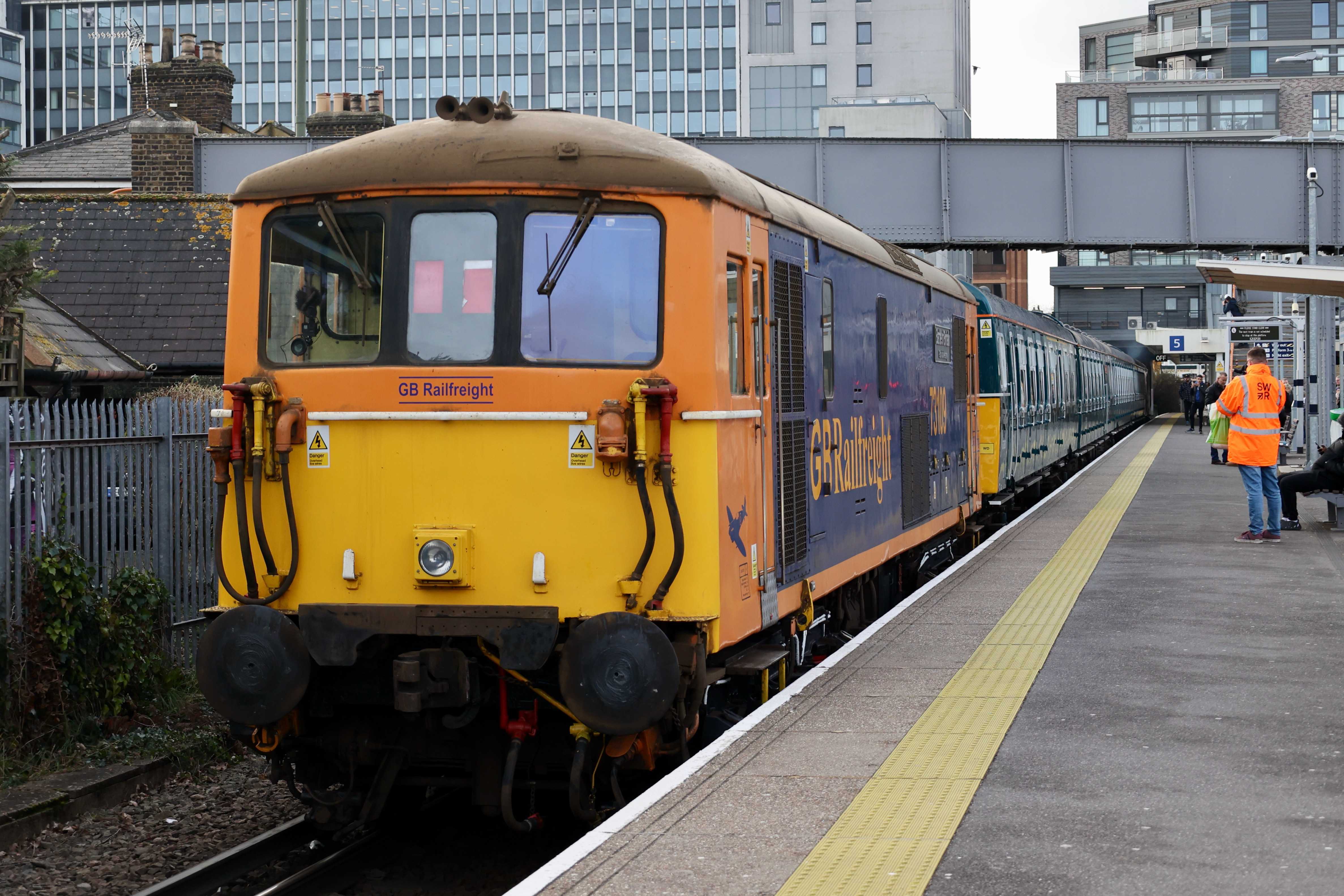 The unit was returned to the mainline certified list on 16th January 2024, however it still needs GSM-R and other safety features to be fitted before it can run under its own power. As a result today's trip from Strawberry Hill depot to Waterloo and back was top and tailed by a pair of GB Railfreight Class 73s, 73109 "Battle of Britain 80th Anniversary" and 73119 "Paul Taylor". The Class 73s came from Tonbridge West Yard as 0Z73 0744 Tonbridge West Yard Gbrf to Strawberry Hill C.S.D. and returned to Tonbridge West Yard after as 0Z74 1402 Strawberry Hill C.S.D. to Tonbridge West Yard Gbrf.