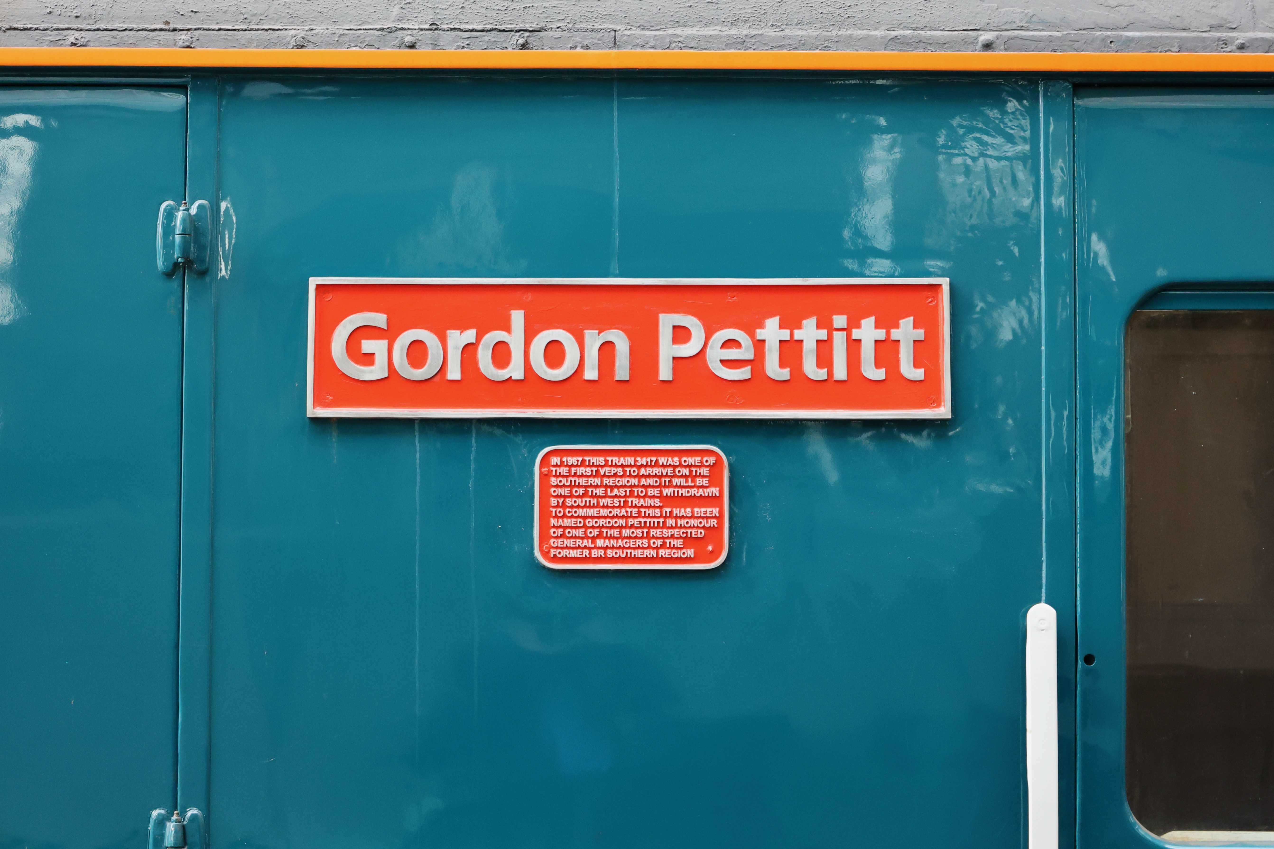 One of the popular photos to take was the "Gordon Pettitt" nameplate. The smaller plate beneath with a short summary of why the unit is important to the history of Southern Region EMUs and why it is named after Gordon Pettitt.