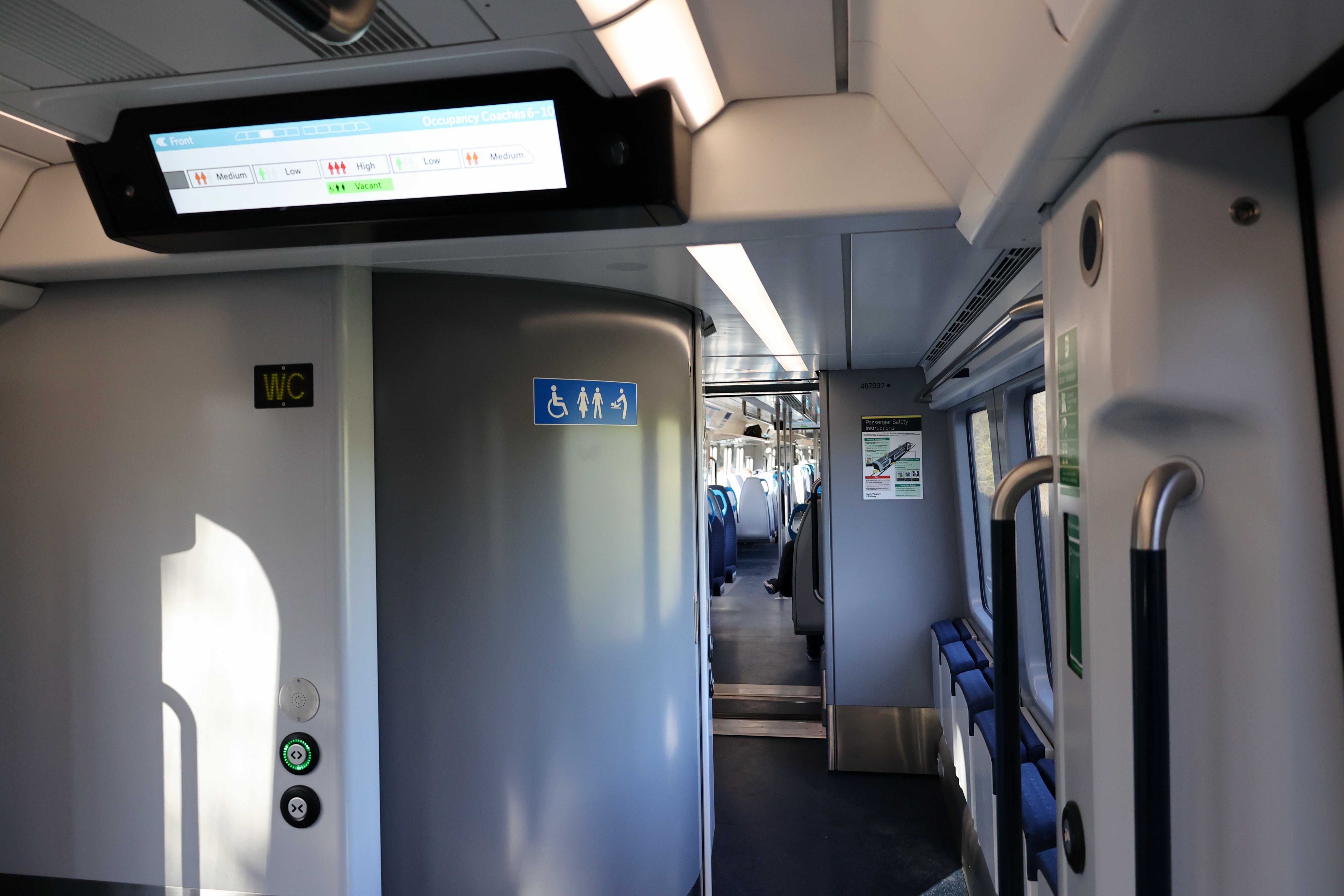 The 10 car 701/0s feature 2 accessible toilets and the 5 car 701/5s feature a single accessible toilet. The area around has tip down seating, however it was noted that the middle tip down seats do block the way past the toilet when they are in use.