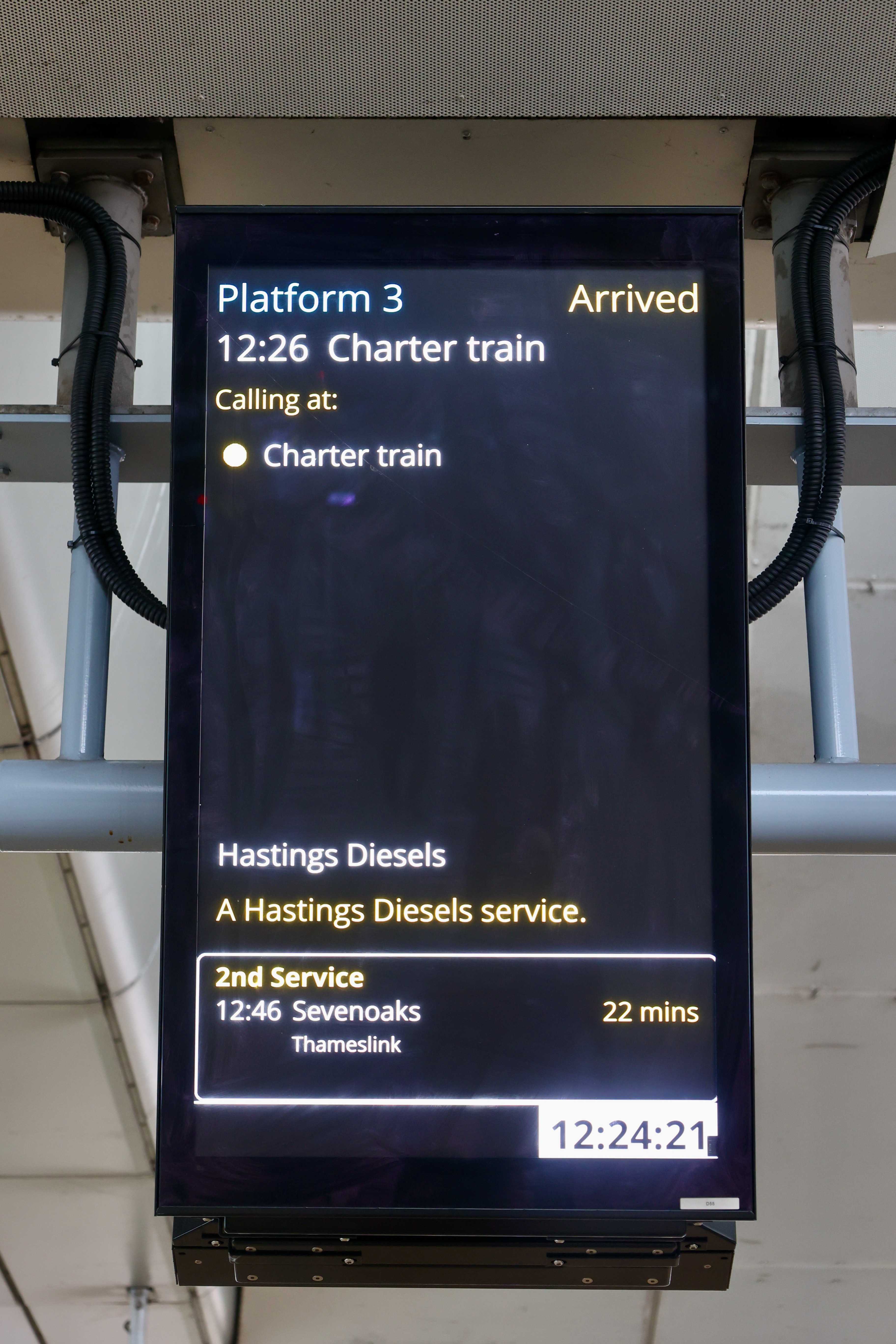 Something I've never seen before is the departure board showing the Hastings Diesels name alongside the "Charter Train" destination and calling points.