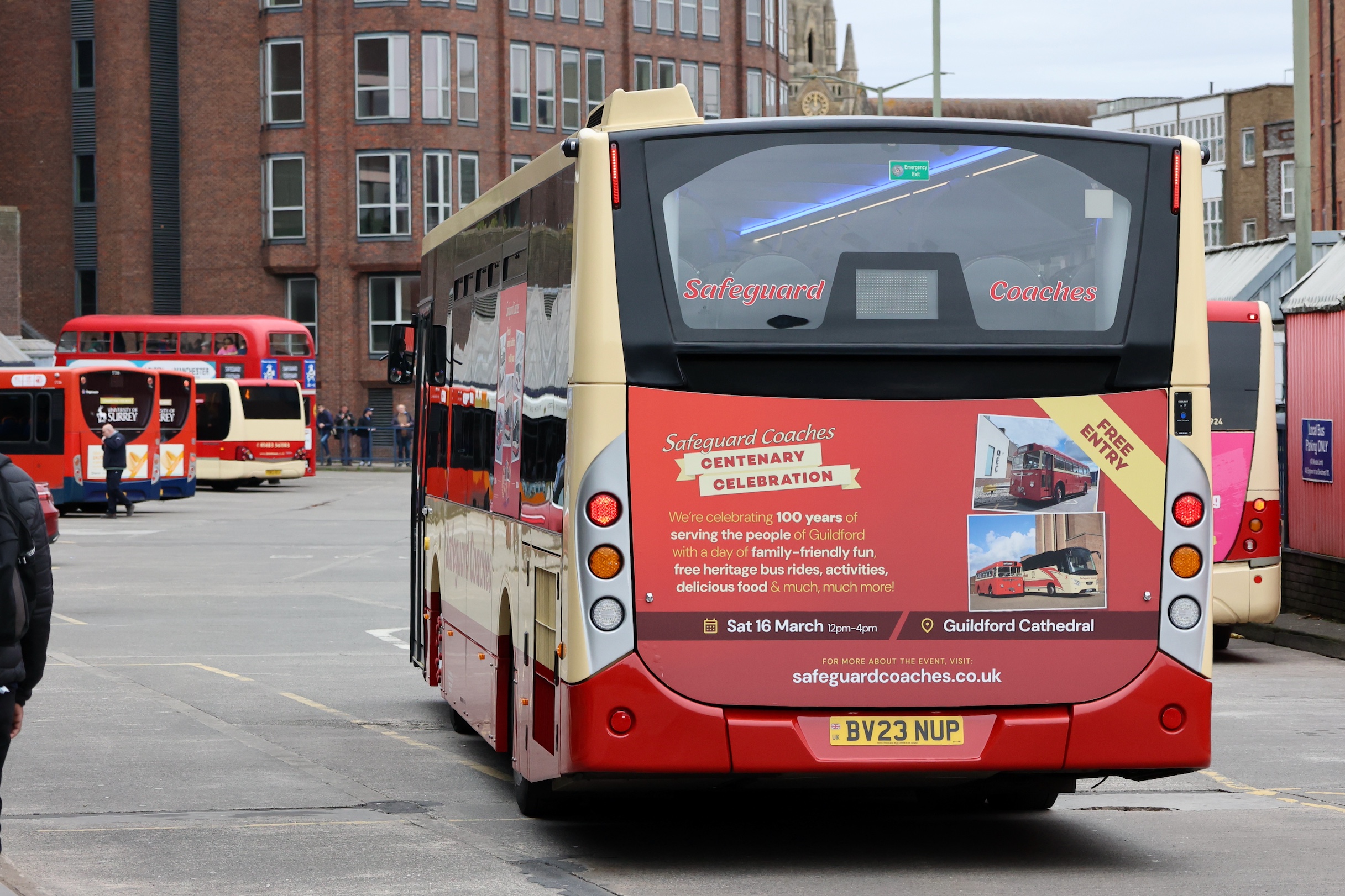 On 16th March 2024, Safeguard Coaches celebrated their 100th anniversary with an event at Guildford Cathedral. The event featured some of Safeguard's current bus and coach fleet as well as some preserved Safeguard buses. The London Bus Museum and Friends of King Alfred Buses were also in attendance with some preserved buses providing links Friary Bus Station and Onslow Park and Ride, as well as round trips to Park Barn estate.