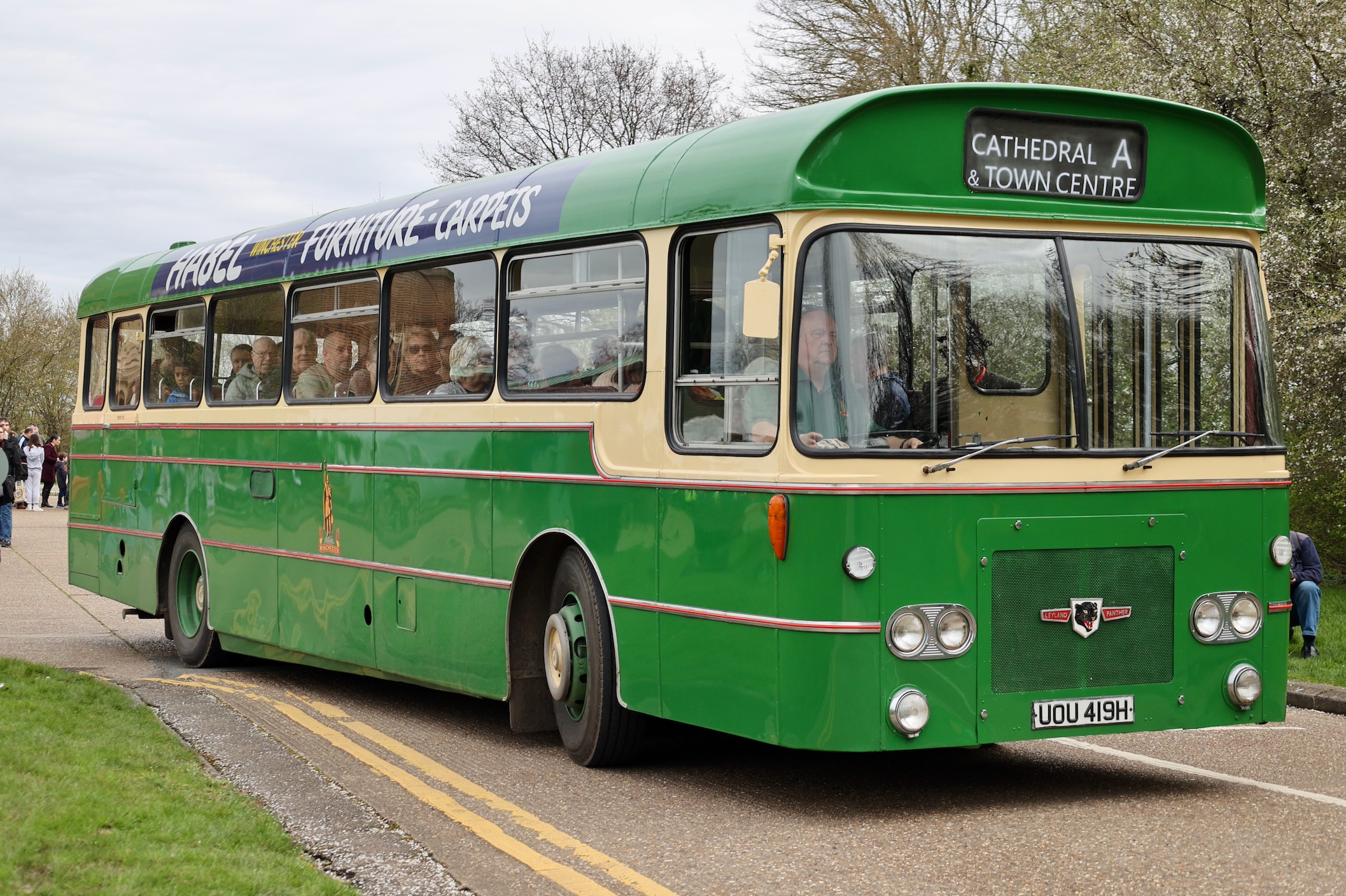 The Friends of King Alfred Buses provided two of their fleet. The first was single decker UOU 419H, a Leyland Panther with Plaxton Derwent body work.