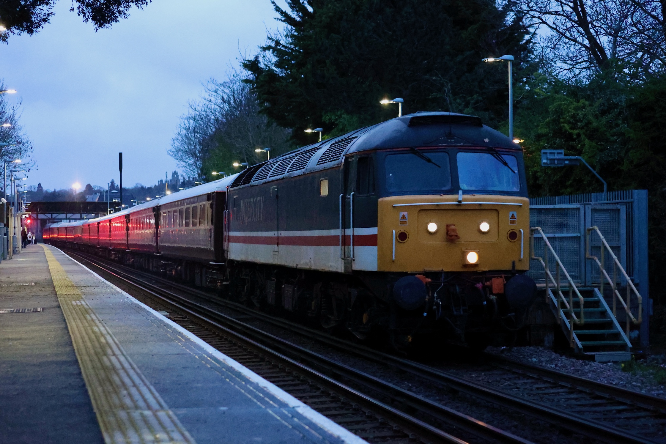 The return journey of the Portsmouth Harbour Statesman was less smooth with a damaged third rail between Portsmouth and Southsea and Portsmouth Harbour, the ECS from Fratton Sidings couldn't get the Portsmouth Harbour. Therefore the return to Chesterfield started an hour late from Portsmouth and Southsea station. This meant that it passed Egham approximately an hour late after sunset.