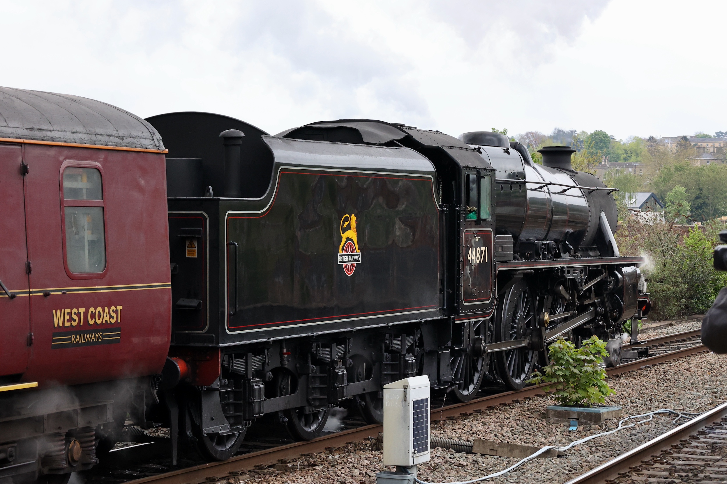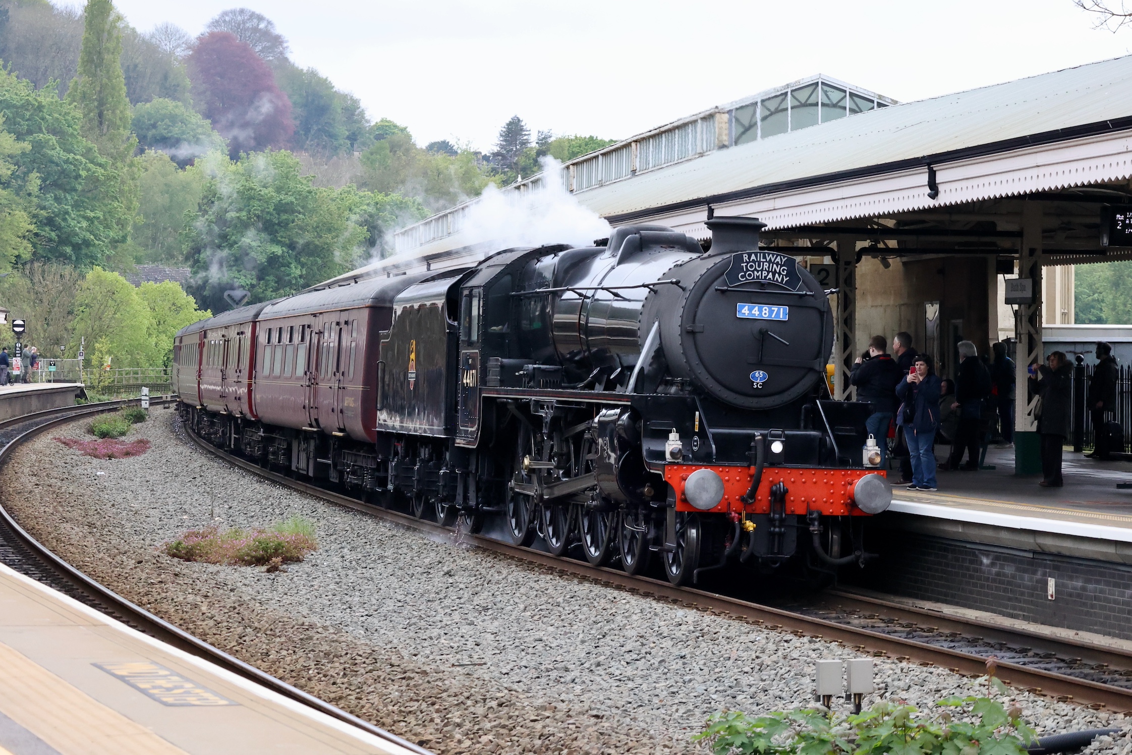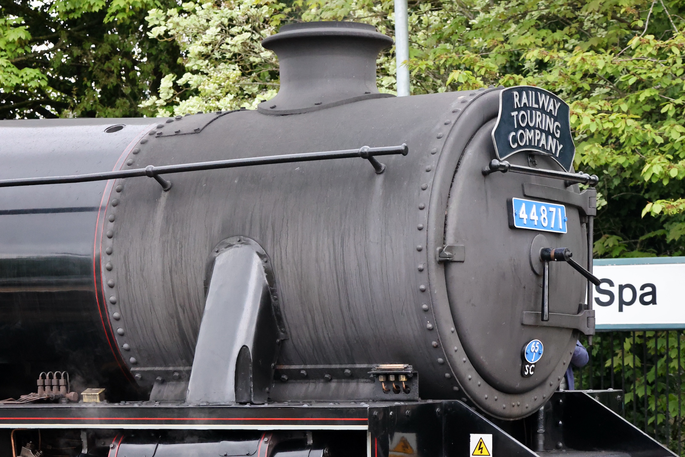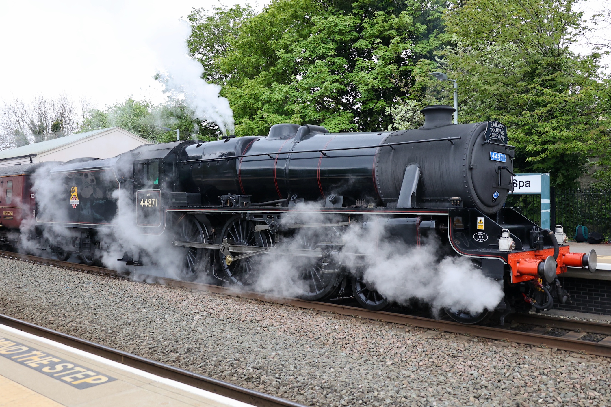 This tour used West Coast Railway's Mark 2 coaches so 44871 stopped within the length of the platform. This allowed for a good look at the recently painted smokebox door number plate and the depot allocation plate.