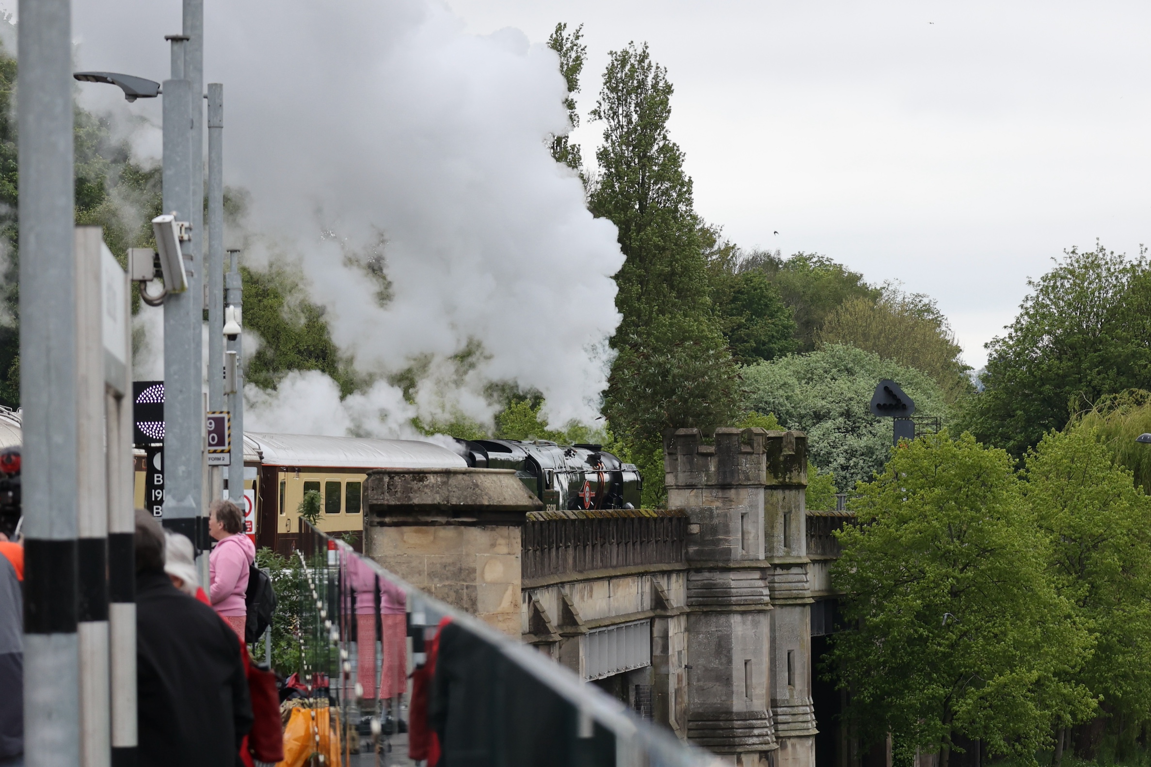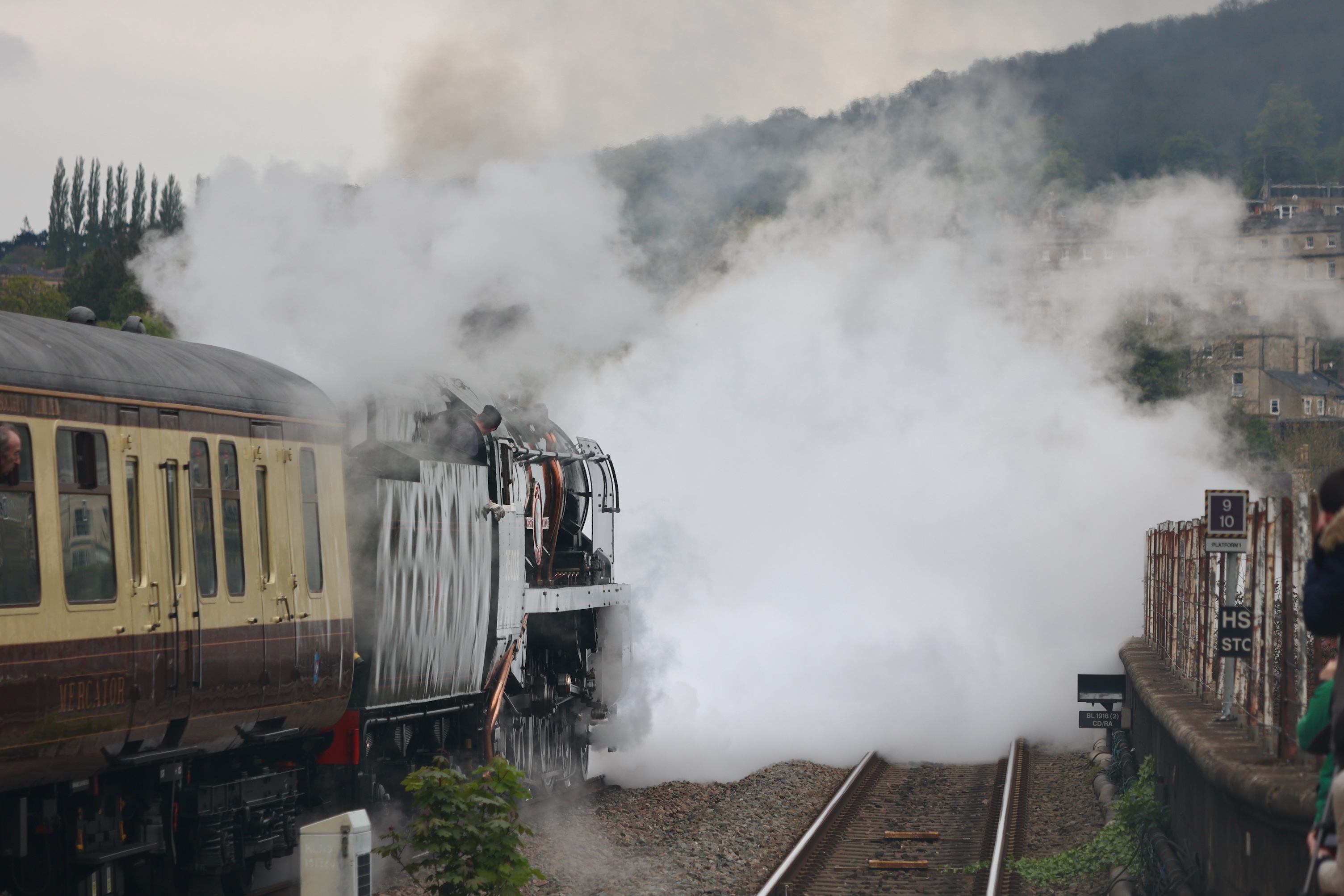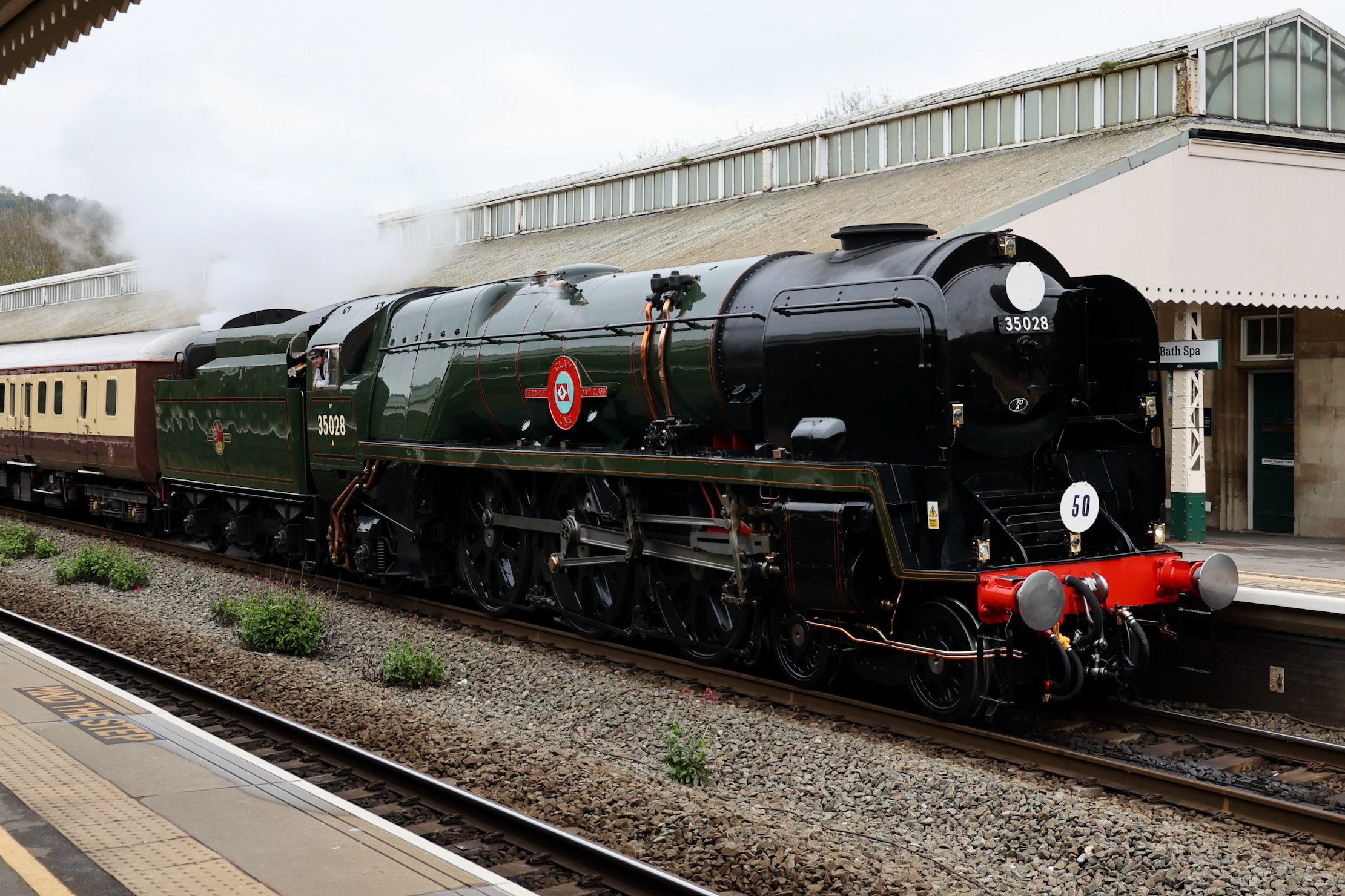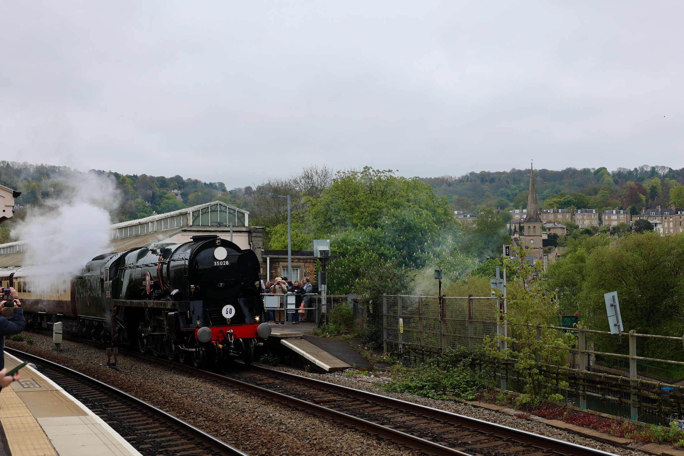 Clan Line with the Belmond set is too long for the platforms at Bath Spa so Clan Line was beyond the end of the station when it stopped. This did allow for a great view down the viaduct as 35028 departed for Salisbury, where it took on water for the rest of the return trip.