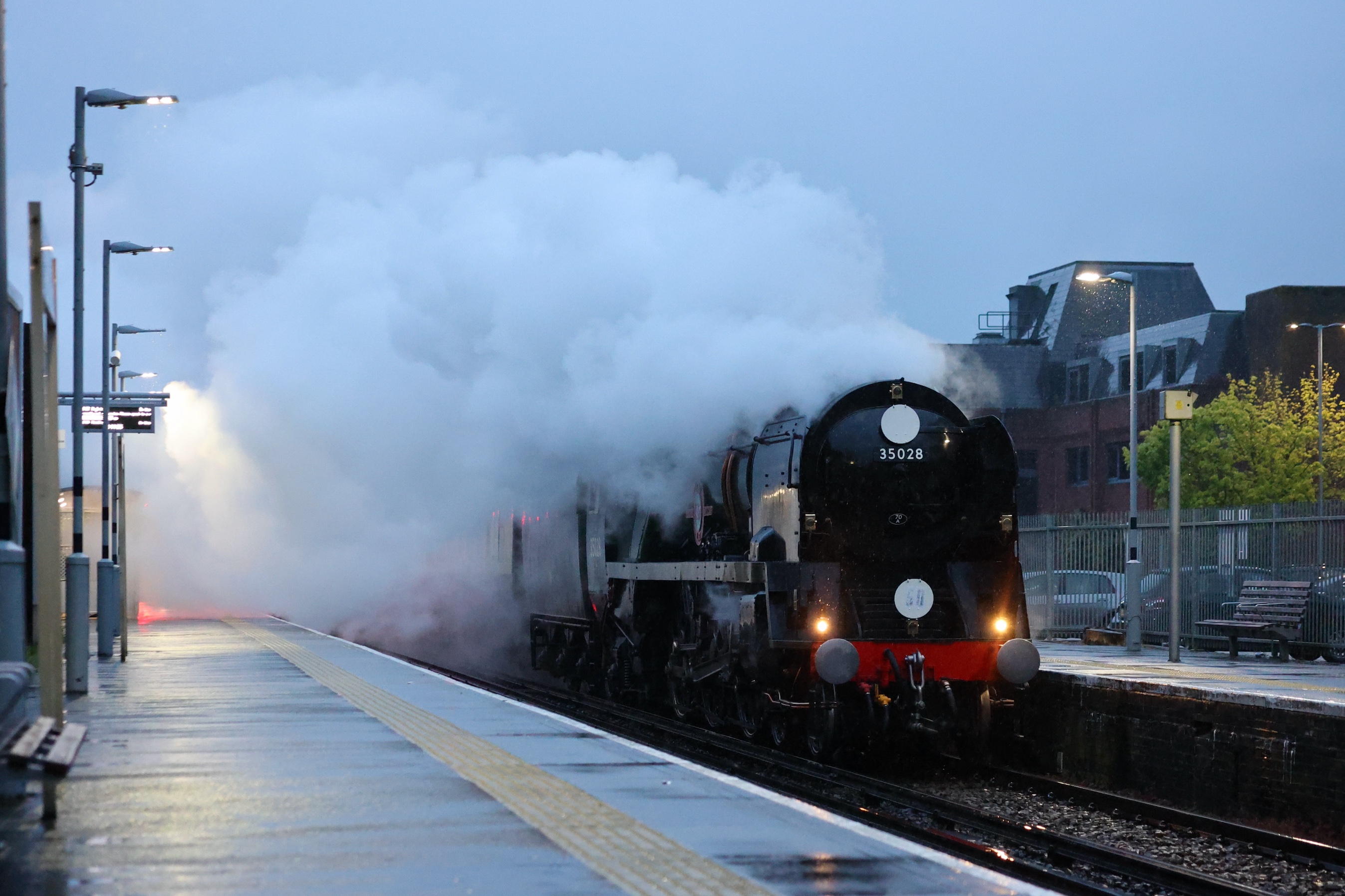 It was then possible to get ahead of it using the Great Western Main Line to Reading and then South Western Railway to Egham. As it was well into the evening by this time, the steam was condensing well creating a giant cloud above as it passed.