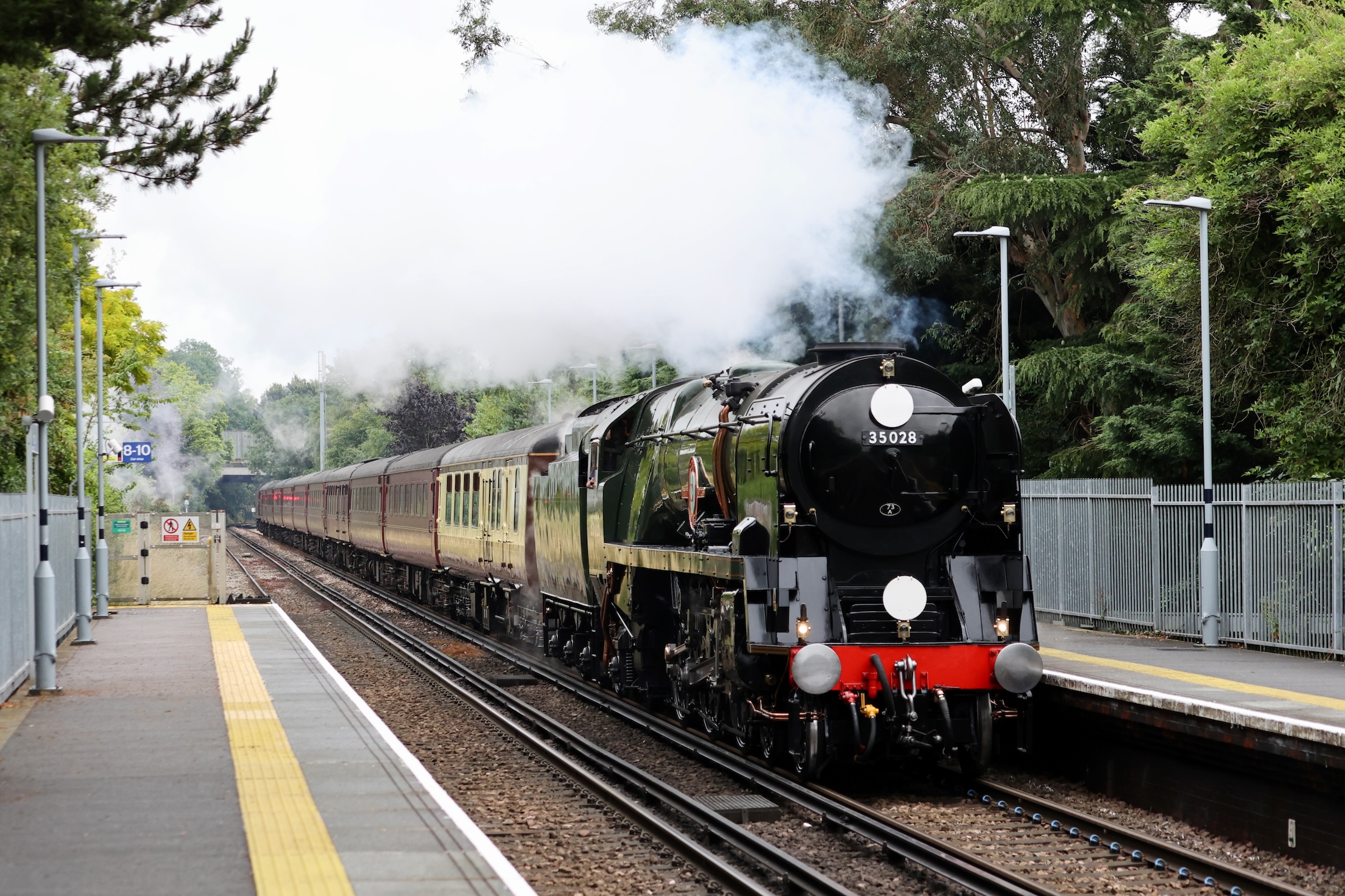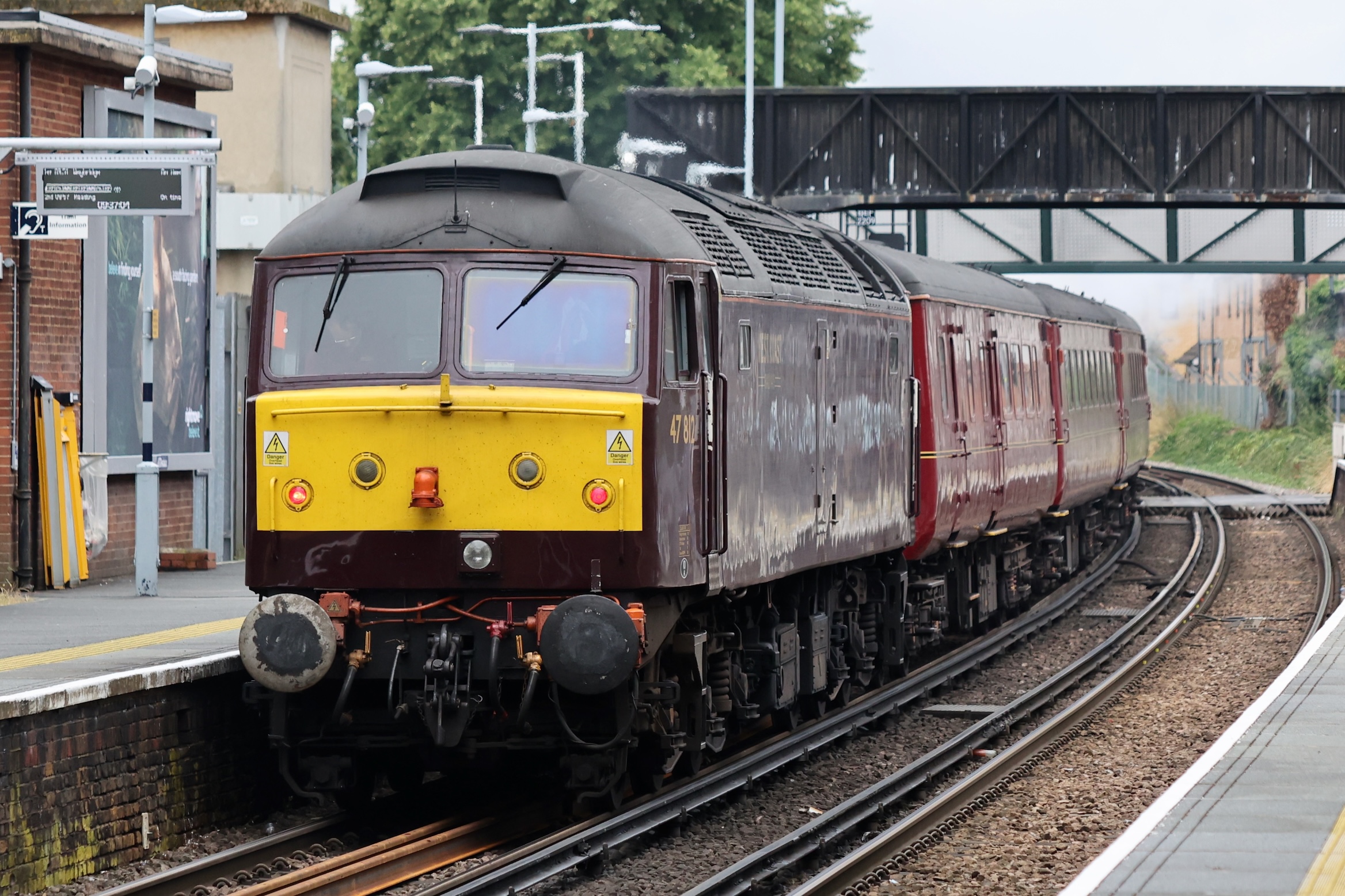 70000 leads the tour past Egham on the way to Chertsey where the water stop is before returning to London Victoria via the Surrey Hills route.
