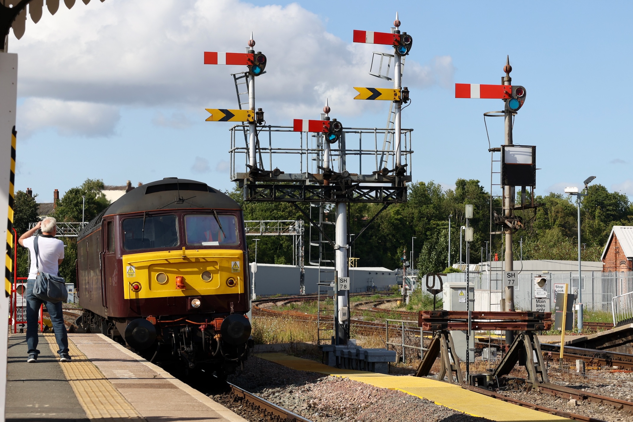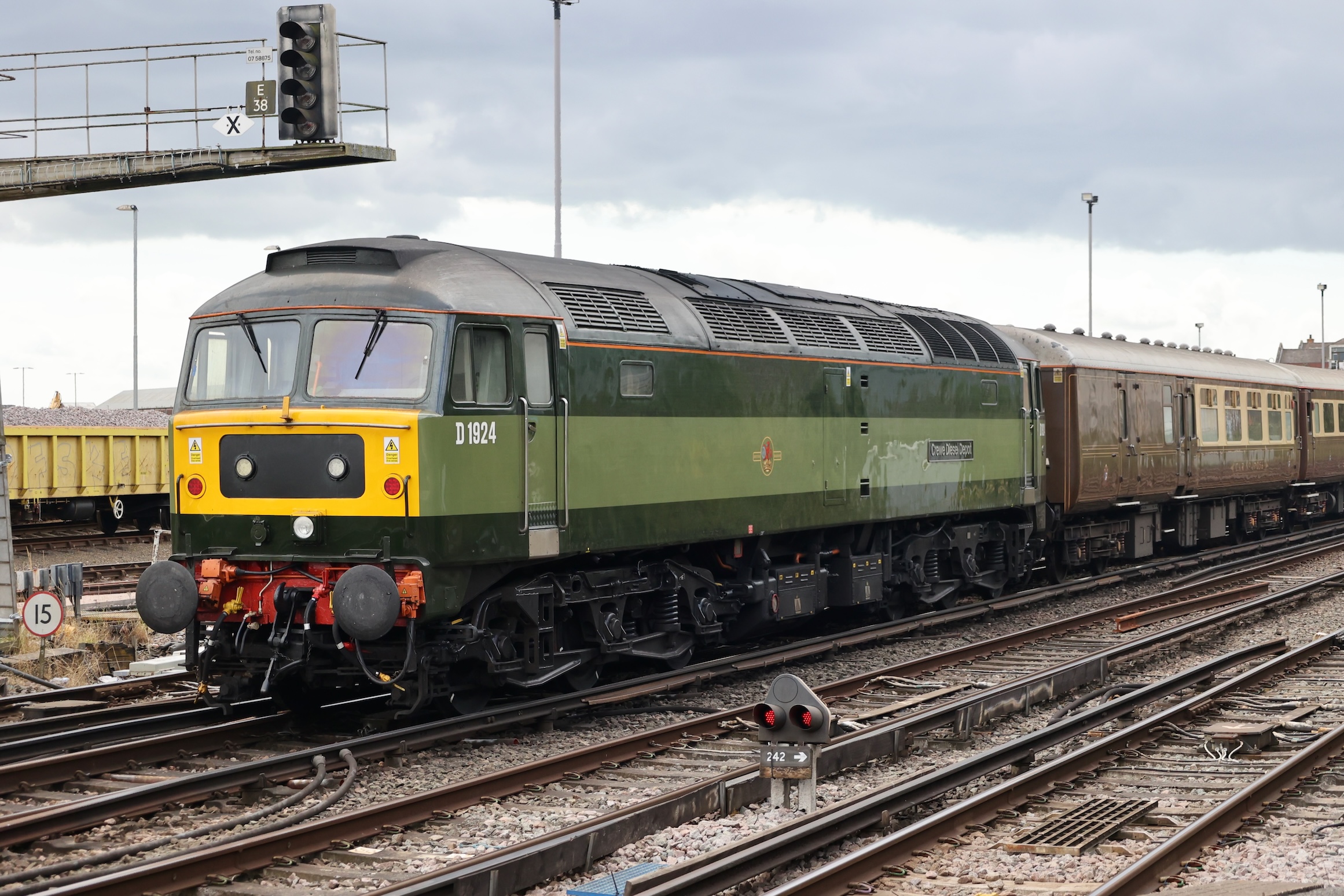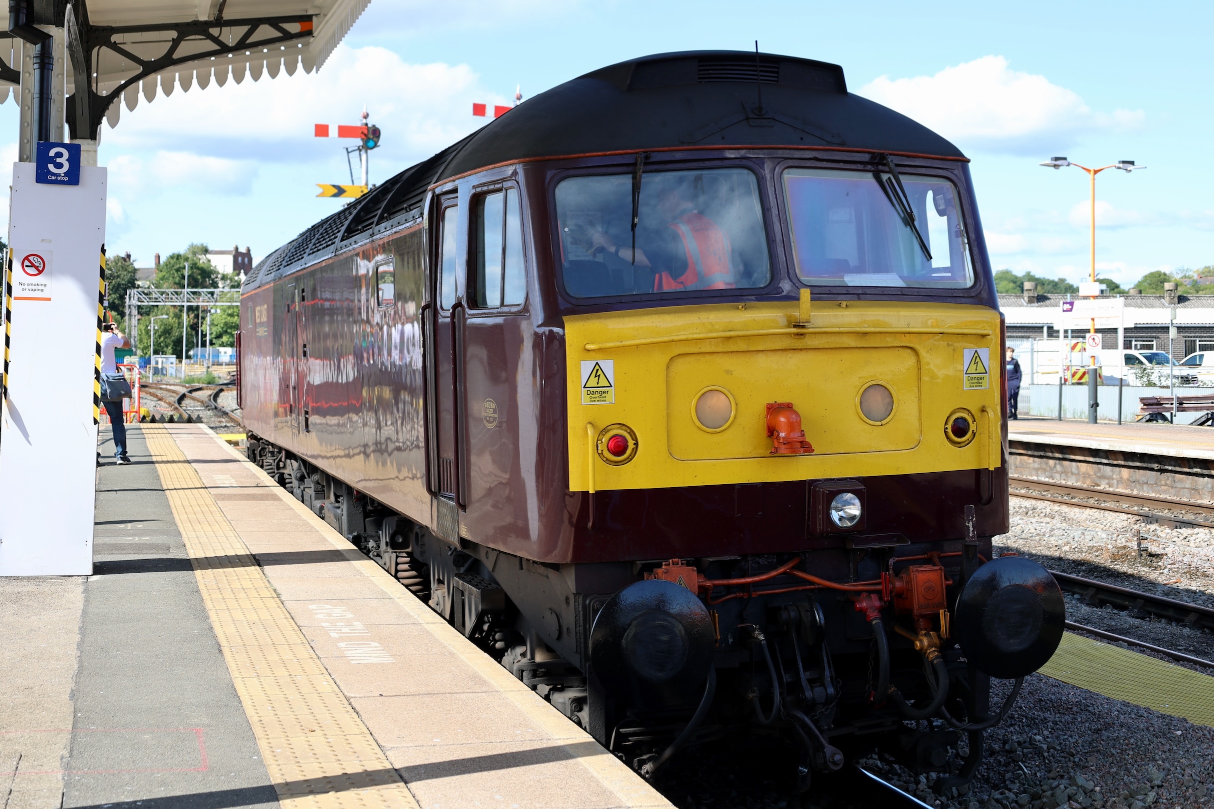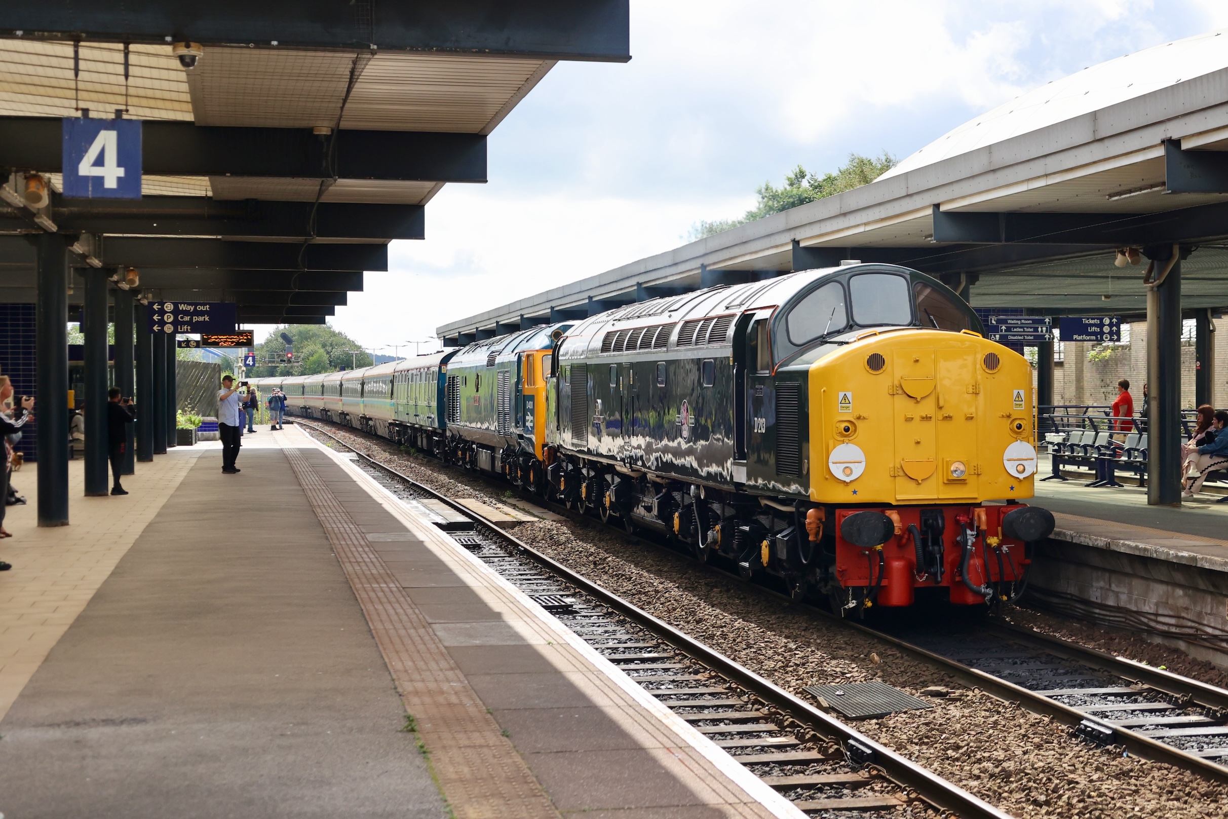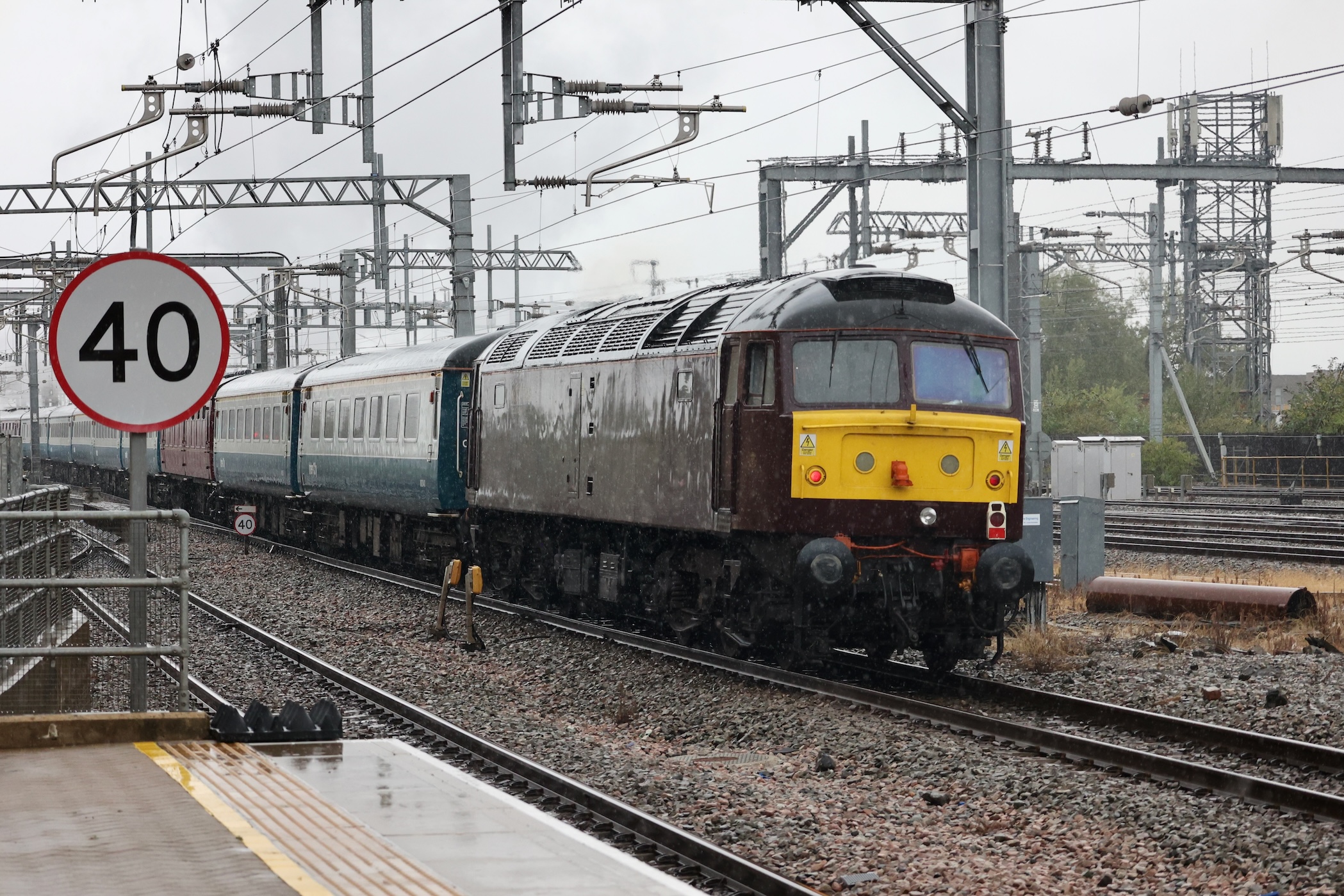 After the 40 and the 50 had departed for Crewe, the Class 37s should have been attached but a signalling problem at Wigan had delayed their arrival with the Class 20s for the final leg.