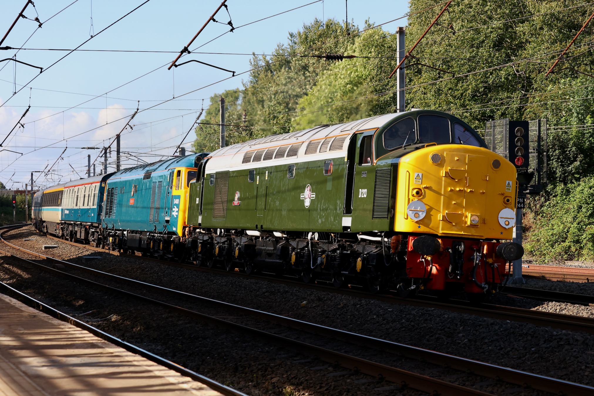 The original plan was for 50050 to return to Crewe at this point in the tour and for 40013 "Andania" to take over but the engine issues resulted in 40013 double heading the train with 50050 behind.