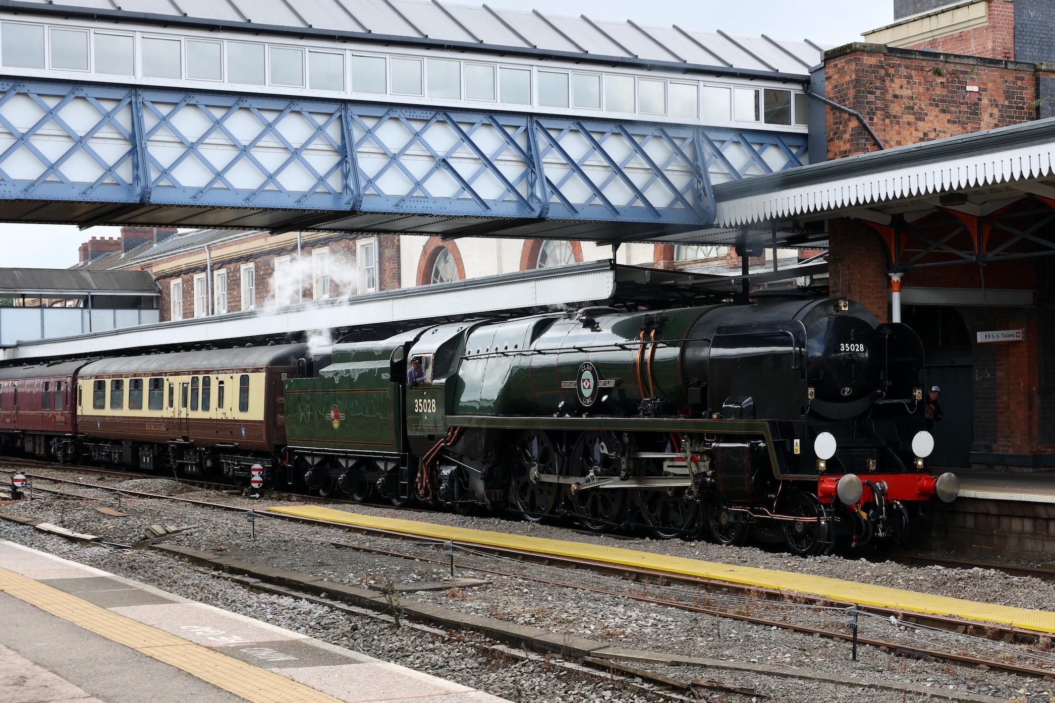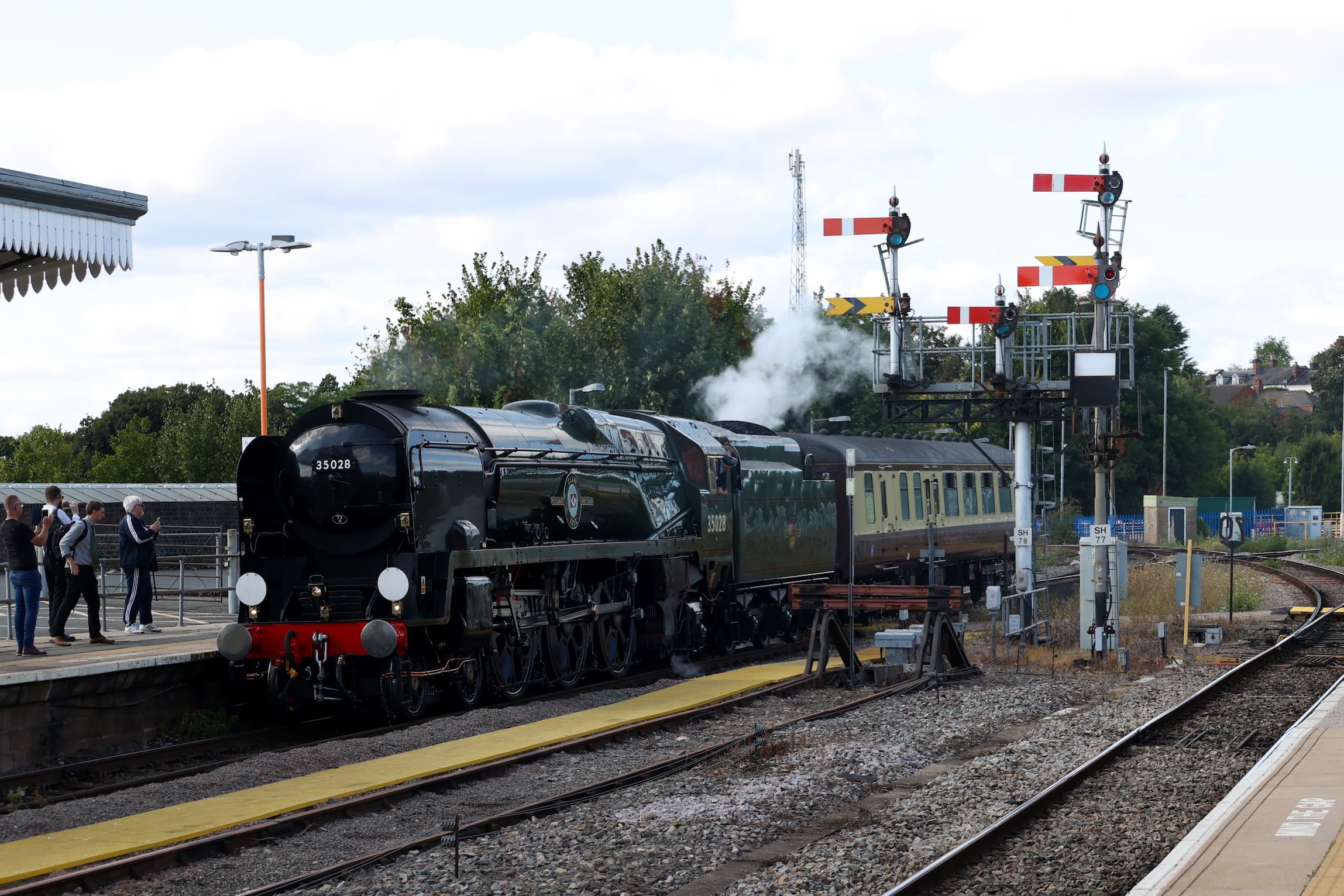 After departing Reading with 35028 leading again, the tour didn't make its planned stop at Challow to reduce the delay down to 29 minutes. After passing Swindon, the tour continued to reduce the delay down to 10 minutes at Cheltenham Spa. The tour was then held at Norton Junction for 15 minutes and building the delay back to 23 minutes at Worcester Shrub Hill, arriving at 14:13.