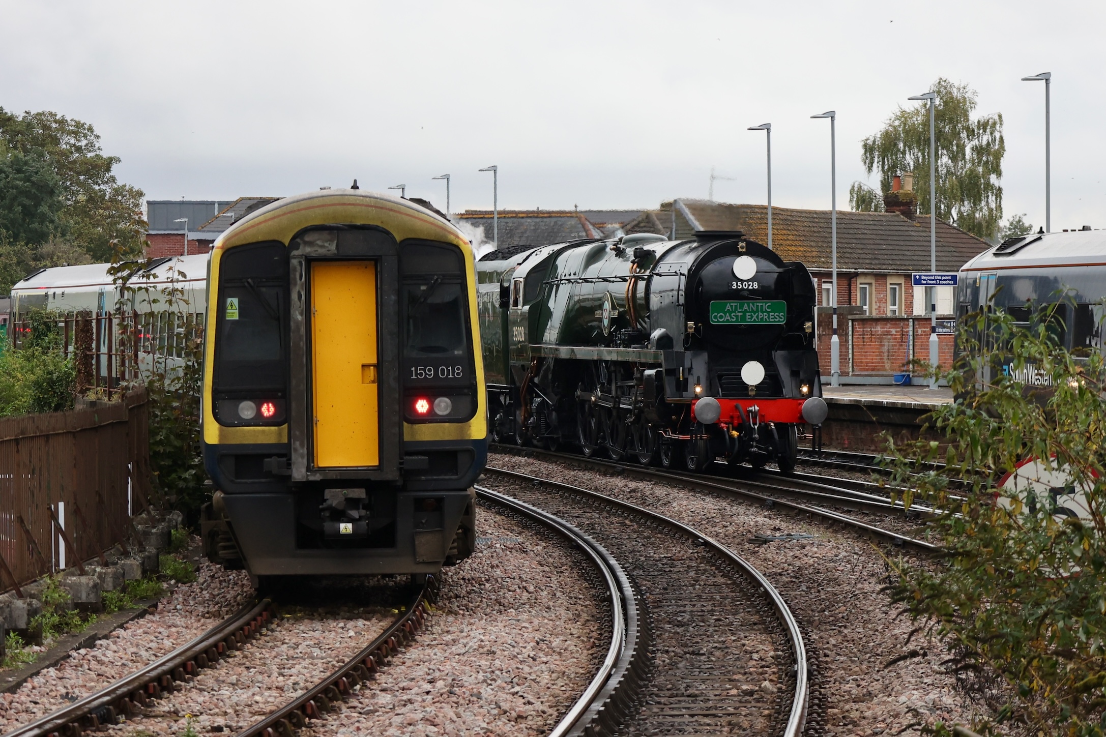 At Westbury, 35028 made a short stop while for a path down to Salisbury after being delayed in the Bristol and Bathampton Junction areas.