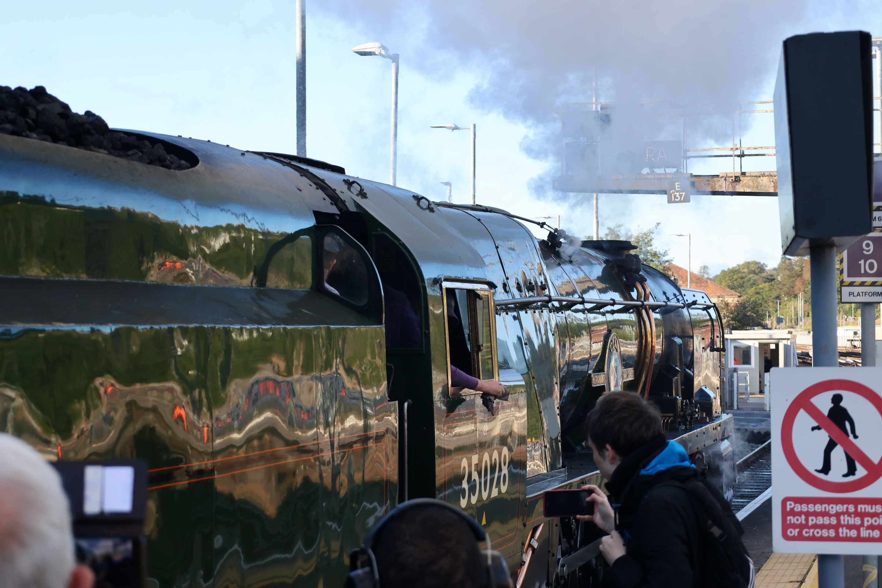 After passing Surbiton and picking up passengers at Woking, 35028 continued on to Winchfield where the first water stop took place. After departing Winchfield, the final group of passengers were picked up at Basingstoke before the tour continued to Salisbury.