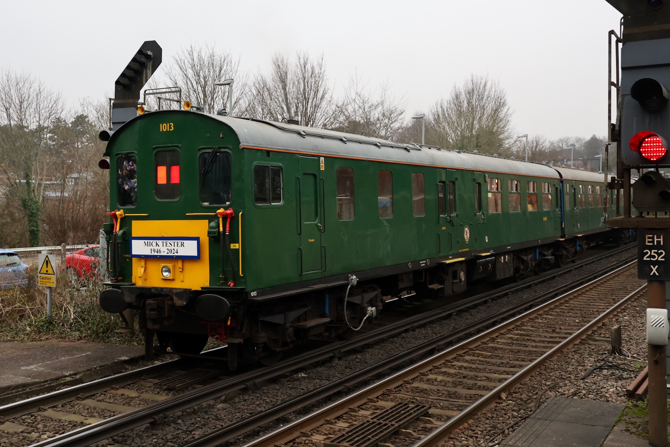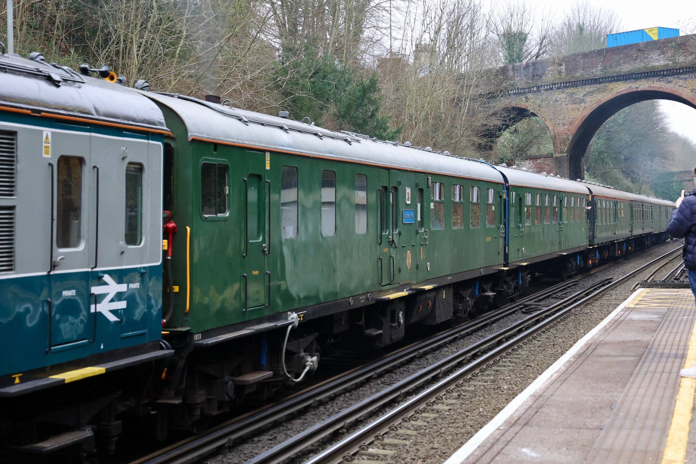 On the return, the trio of motor coaches lead the train from Eastleigh to Winchester to collect the passengers that alighted there earlier.