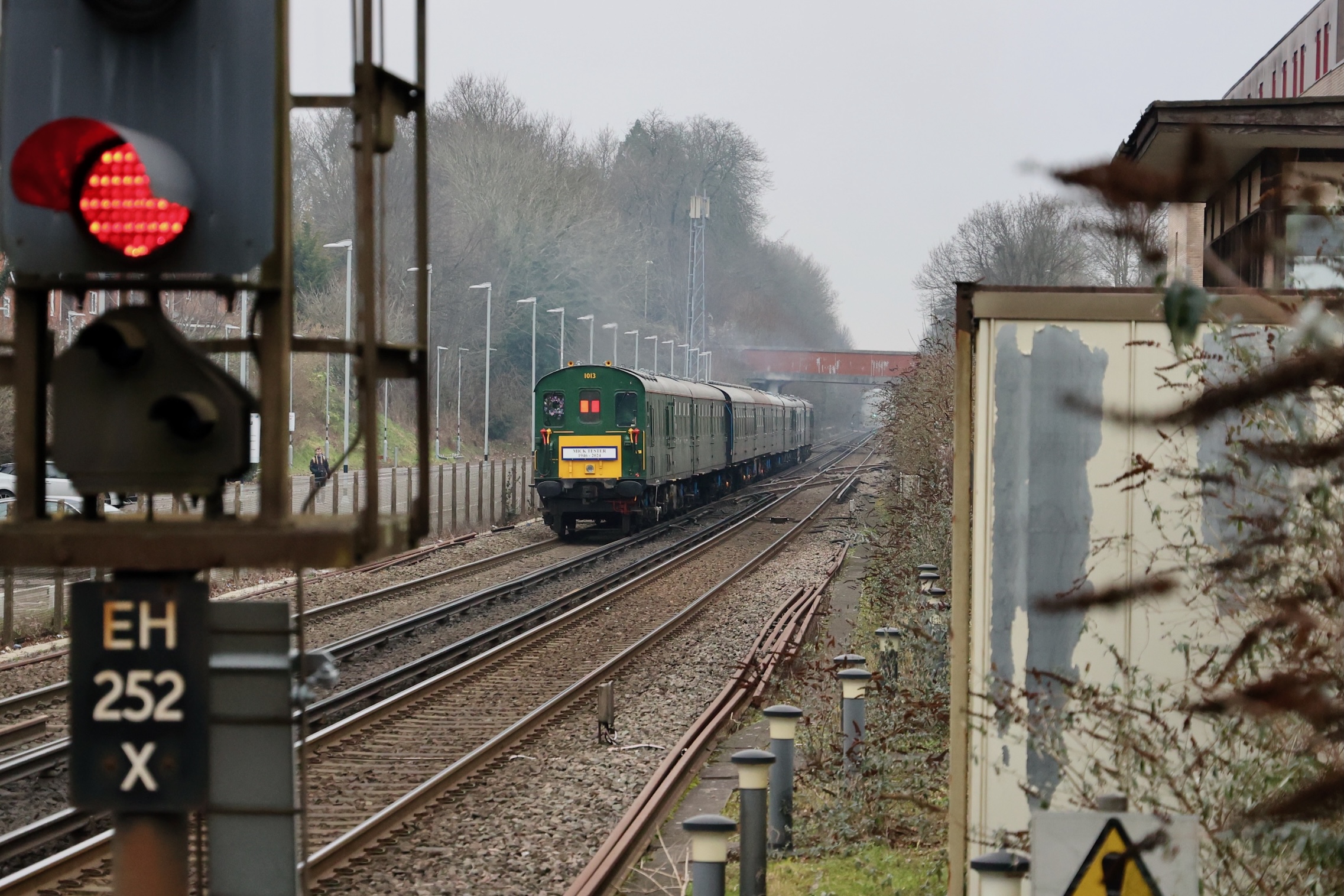 After dropping off the first group of passengers at Winchester, the train continued to Eastleigh where the second group of passengers were dropped off. The train then reversed into Eastleigh East Yard for a break and to be prepared for the return in the afternoon.